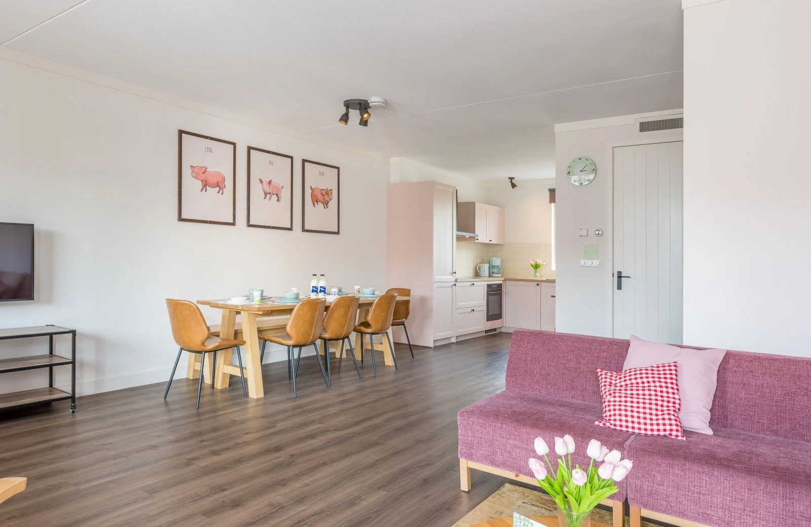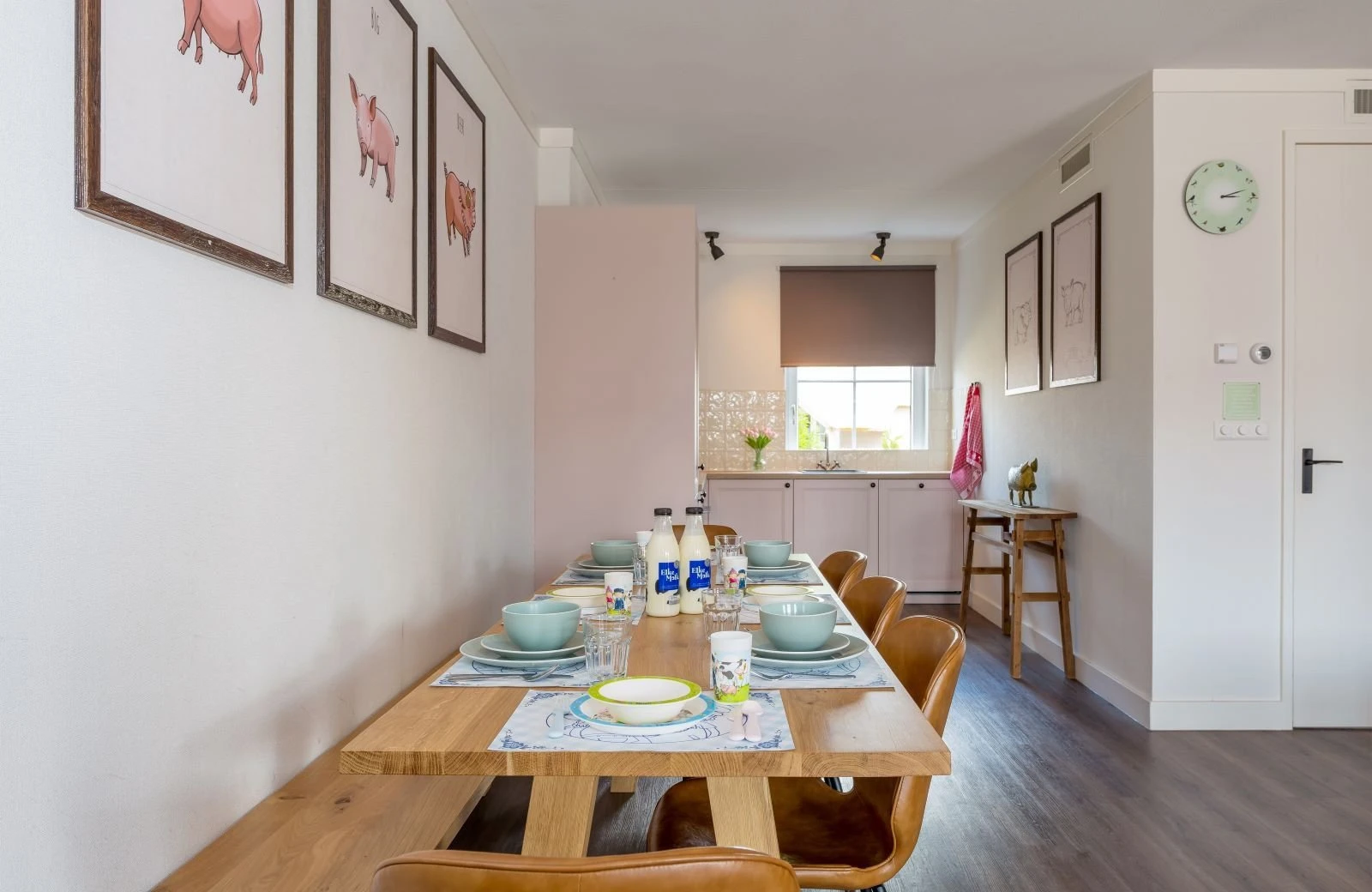 Deze accommodatie is onderdeel van een rijtje aaneengeschakelde woningen. De 8-persoons Dorpsstraat bestaat uit twee woonlagen en is van alle gemakken voorzien. De woning is volledig ingericht in Sebastiaan het varken stijl en heeft een gezellige woonkamer met zit- en eethoek. Omdat Sebastiaan het varken bekend staat om zijn vrolijke karakter, kan je zeker zijn van een vrolijk roze verblijf.