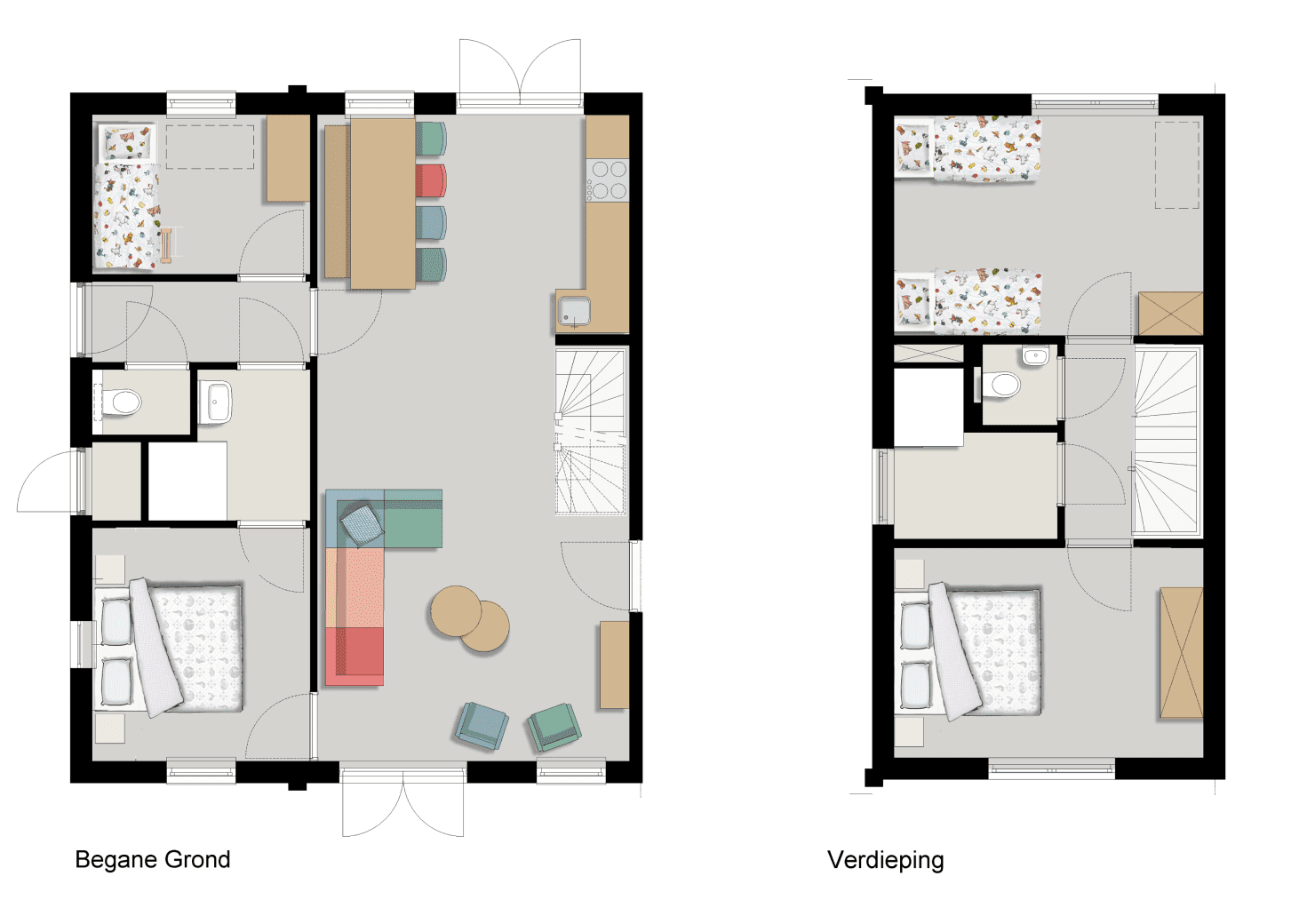 Een onbezorgde nachtrust heb je in de vier ruime slaapkamers. Twee hiervan bevinden zich op de begane grond, waarvan één met een tweepersoons boxspring en één met een stapelbed. Op de eerste verdieping van de woning vind je nog twee slaapkamers, waarvan één met een tweepersoons boxspring en één met twee eenpersoonsbedden. Beide woonlagen beschikken over een badkamer met douche en apart toilet.