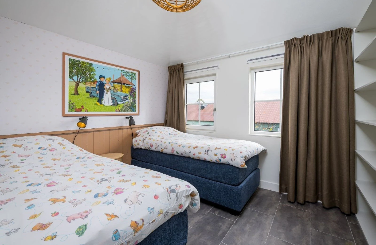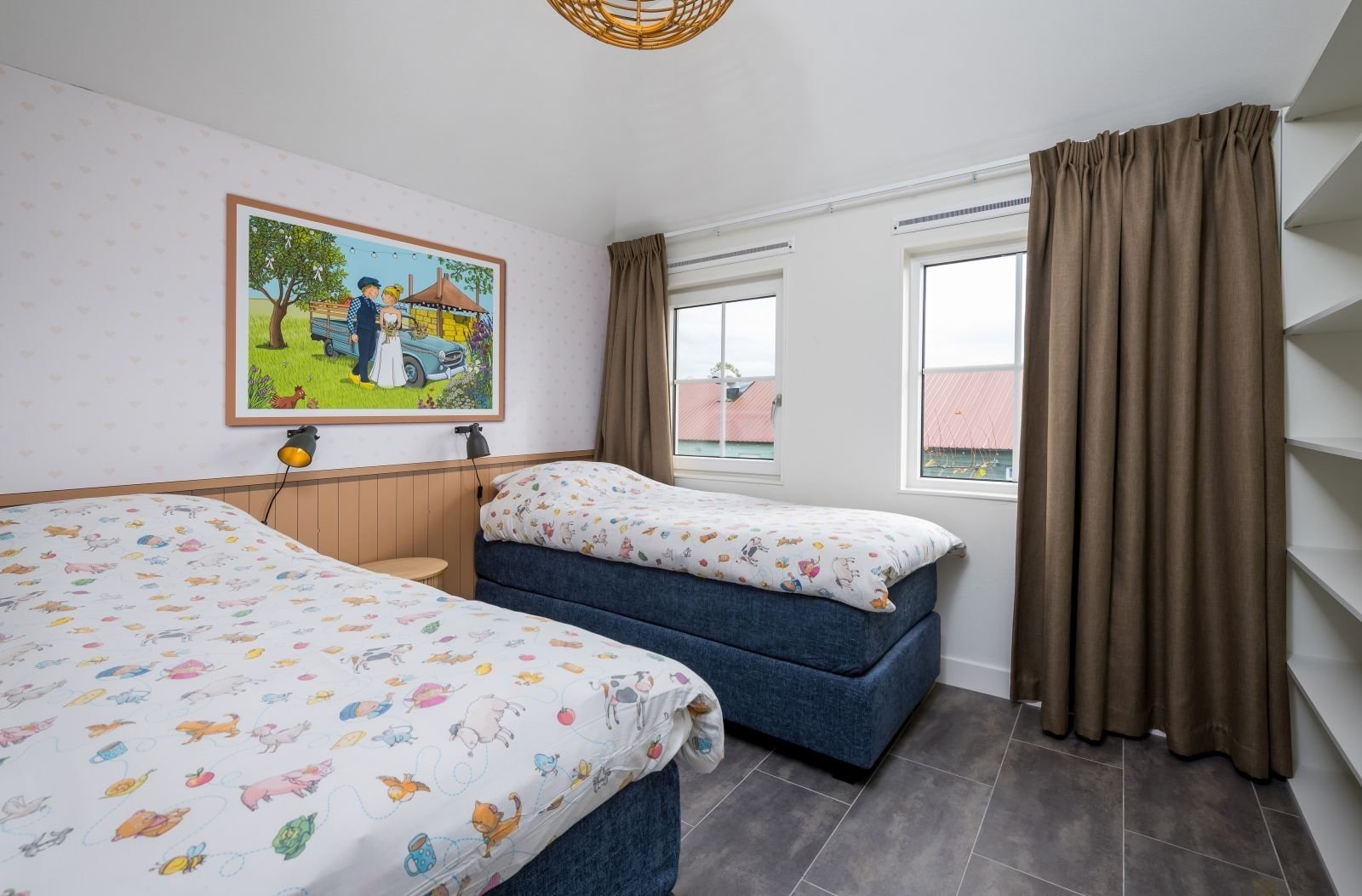 - Slaapkamer 2: Twee eenpersoons boxsprings met een inbouwkast