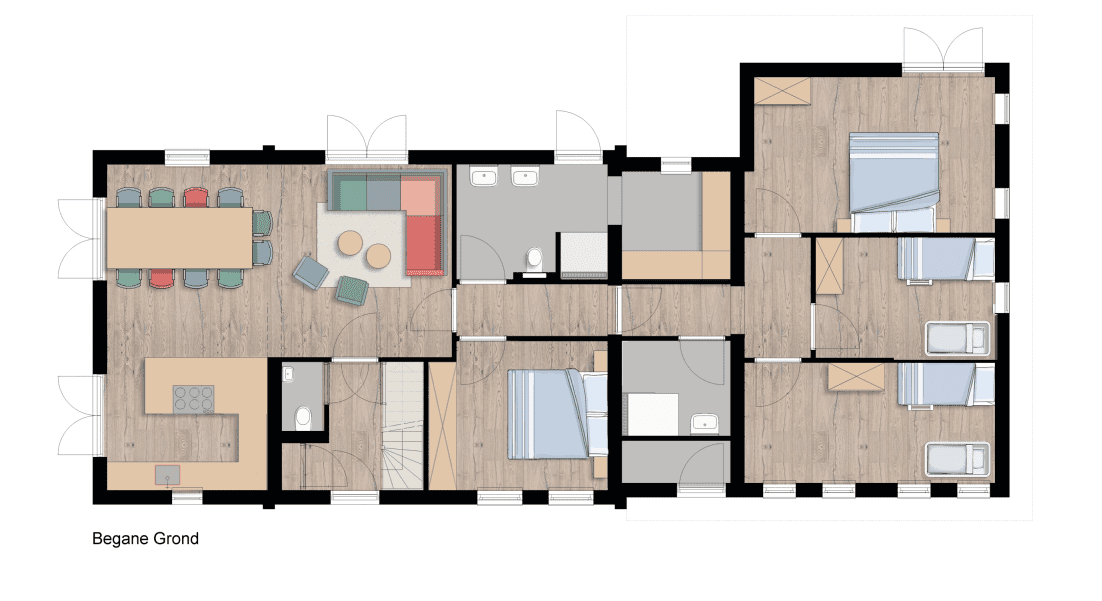 Op de begane grond zijn vier slaapkamers, in deze slaapkamers vind je het volgende: