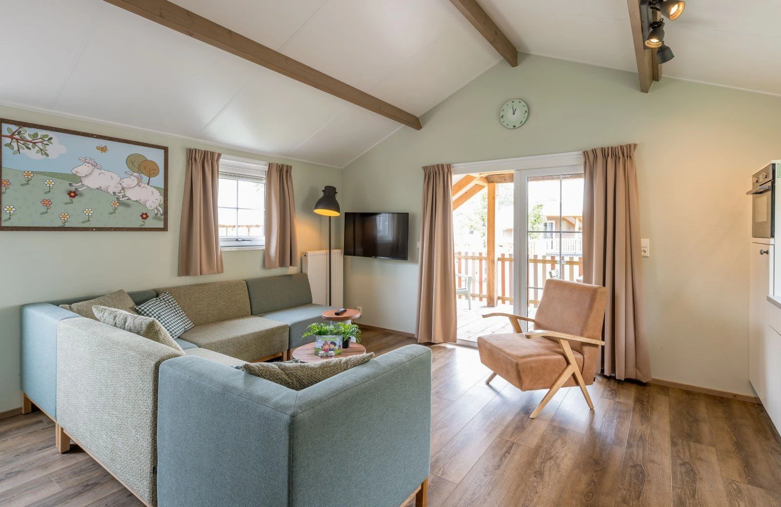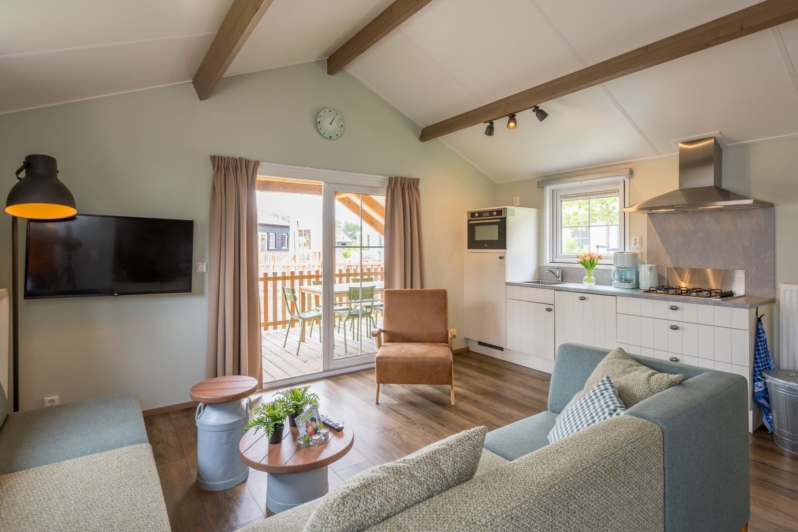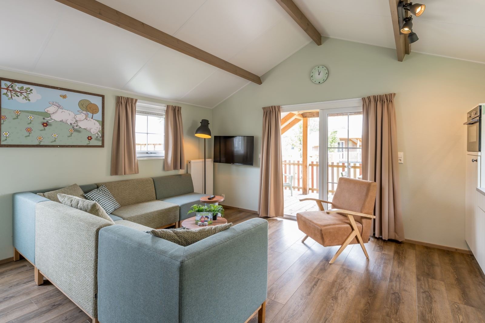 Overdag stap je vanuit de woonkamer direct op jouw eigen omheinde veranda en geniet je van een prachtig uitzicht over de schapenweide. Hollandser wordt het niet! Kom jij ook gezellig logeren?