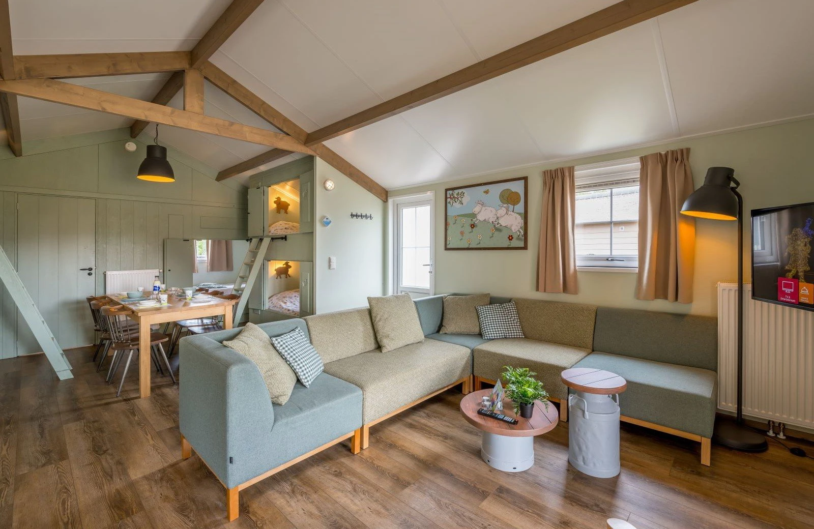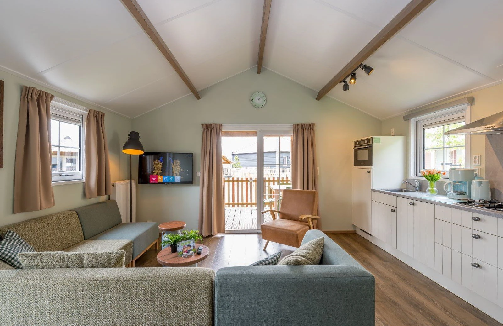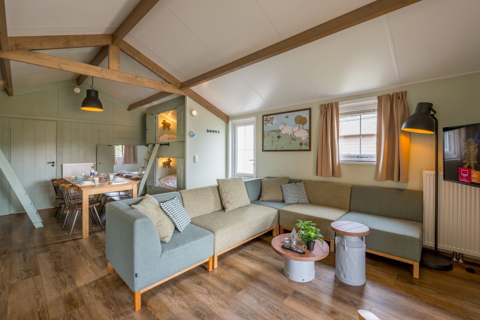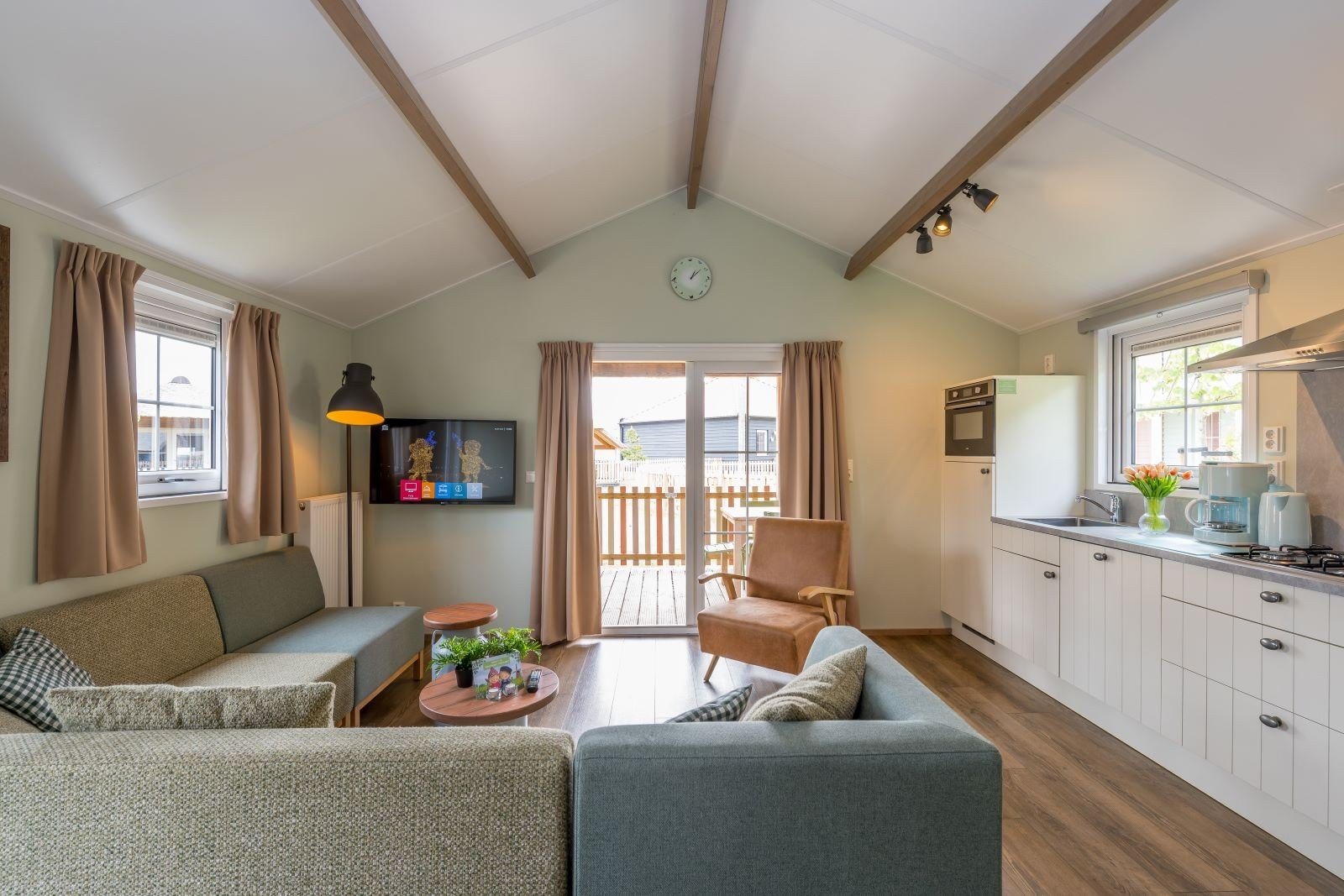 Overdag stap je vanuit de woonkamer direct op jouw eigen omheinde veranda en geniet je van een prachtig uitzicht over de schapenweide. Hollandser wordt het niet! Kom jij ook gezellig logeren?