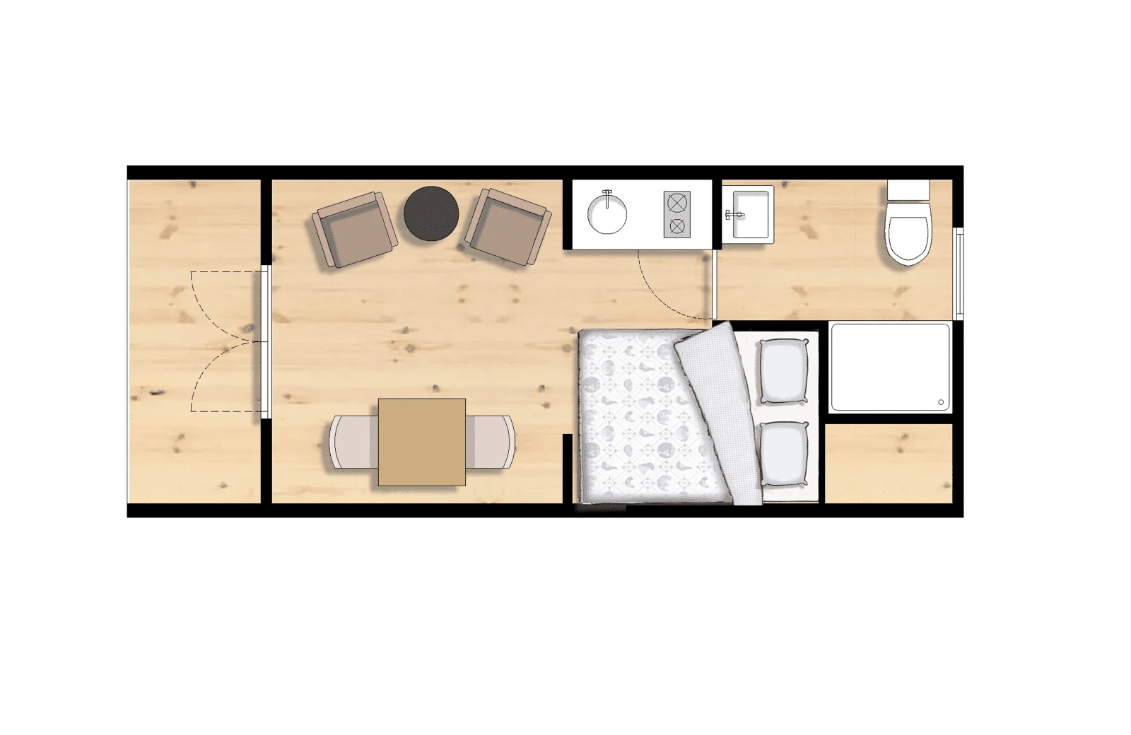 Deze Polderlodge beschikt over alle benodigde voorzieningen in natuurlijke eenvoud: een leefruimte met een eethoek en comfortabel tweepersoonsbed. De compacte keuken is voorzien van onder andere een kookplaat en koelkast. Natuurlijk heeft de Polderlodge ook een badkamer met douche en toilet. Alle Polderlodges zijn Full Electric. Het water in alle polderlodges wordt verwarmd door middel van een Boiler.