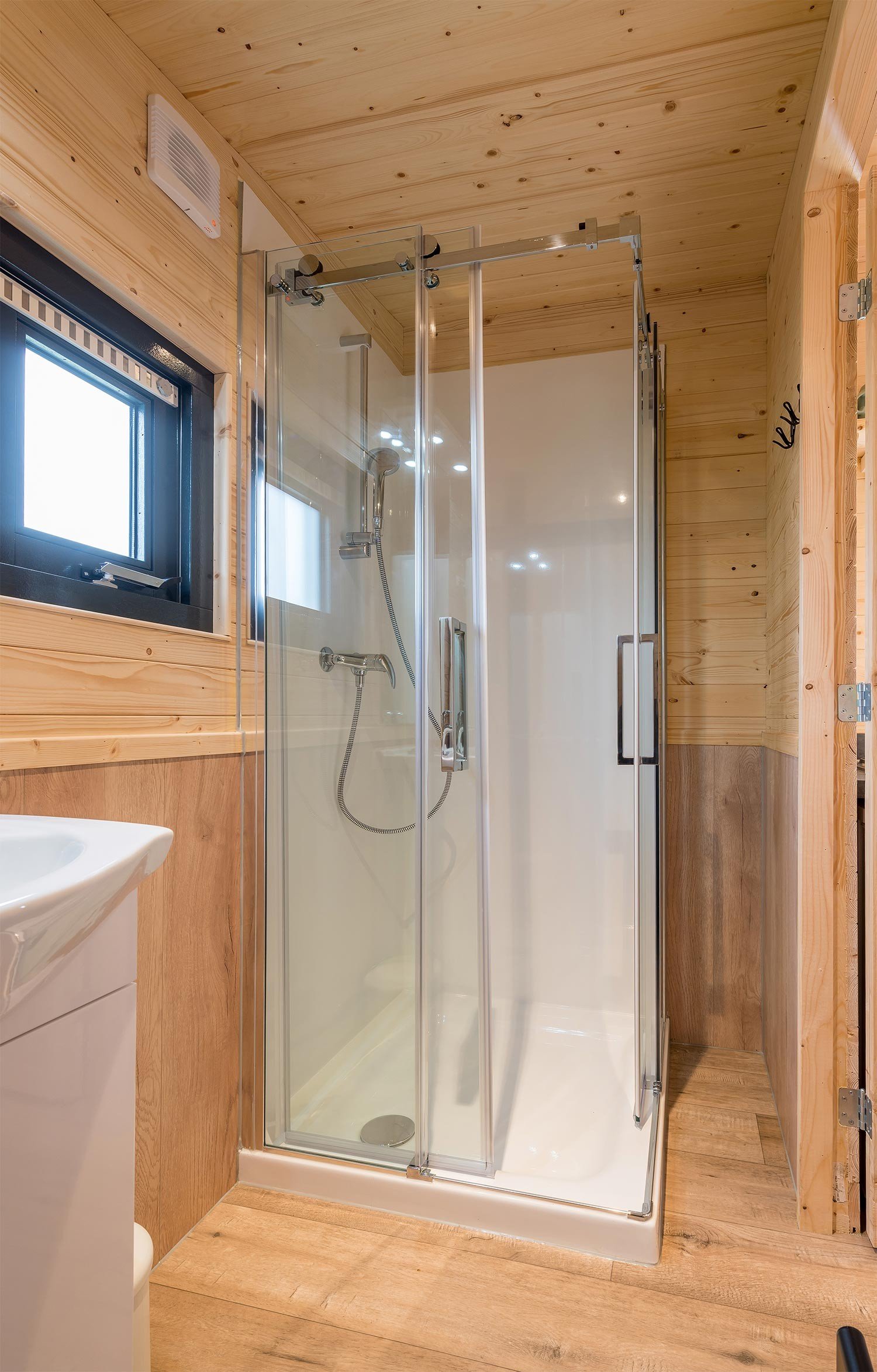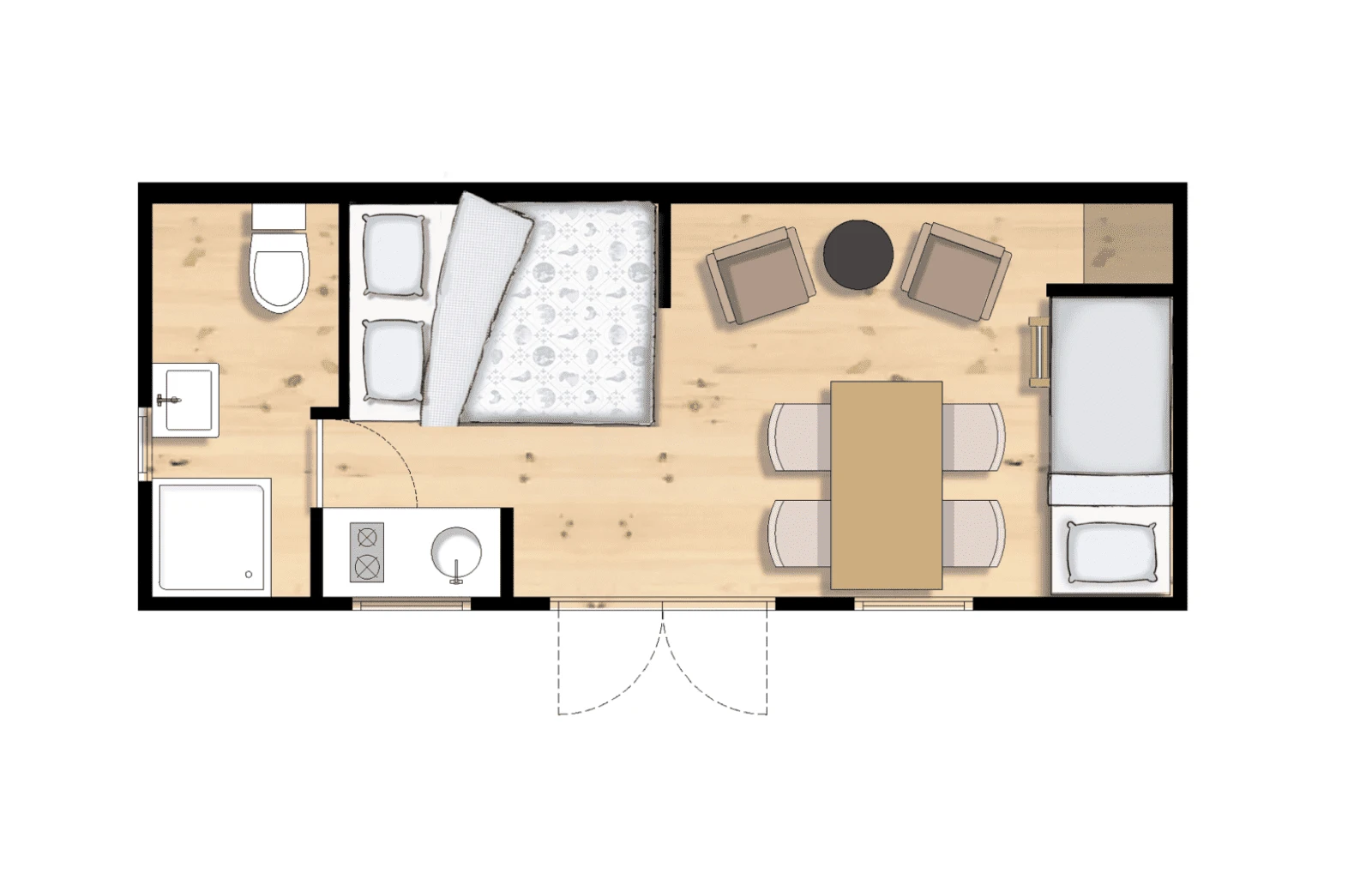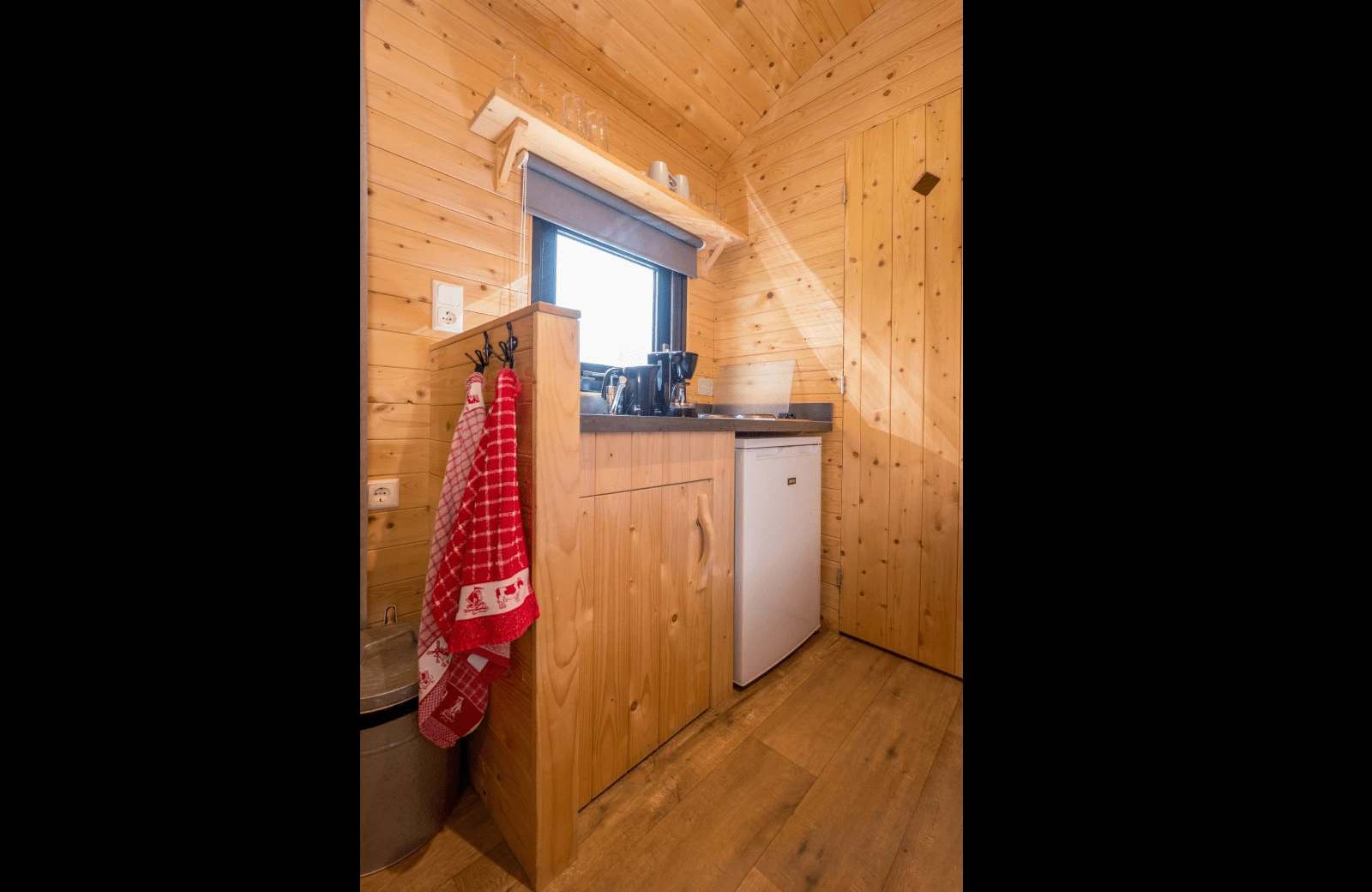 Deze Polderlodge beschikt over alle benodigde voorzieningen in natuurlijke eenvoud: een leefruimte met een eethoek, comfortabel tweepersoonsbed en stapelbed. De compacte keuken is voorzien van onder andere een kookplaat en een koelkast. Natuurlijk heeft de Polderlodge ook een badkamer met douche en toilet. Alle Polderlodges zijn Full Electric. Het water in alle polderlodges wordt verwarmd door middel van een boiler.